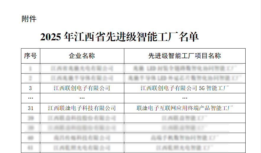 近日,江西省工业和信息化厅正式公布2025年江西省“先进级智能工厂”名单,186家企业入选。其中乐动·体育,乐动(中国)、江西联淦电子科技有限公司2家联创电子系企业名列榜单。这标志着公司在智能制造领域的创新成果再次获得政府权威认可。
